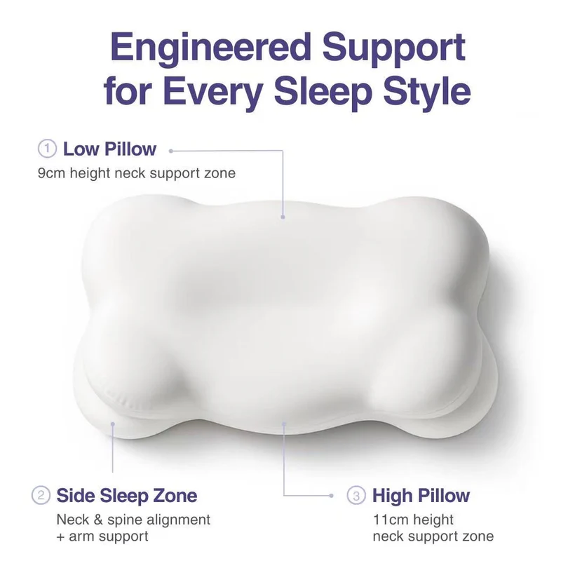 The Cloud Align Pillow features a high side and a low side,simply flip it to match your body and sleep position. It gently cradles your head, supports your neck, and helps keep your spine aligned all night long. No fluffing. No stacking. Just smarter sleep.